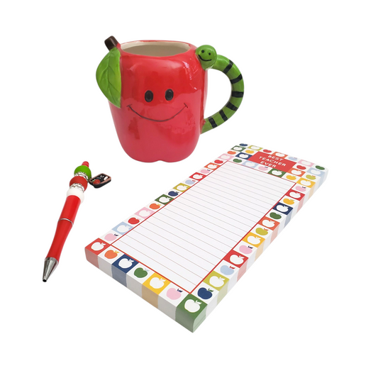 Red Apple & Worm Mug / Note Pad / Beaded Pen / Gift Set