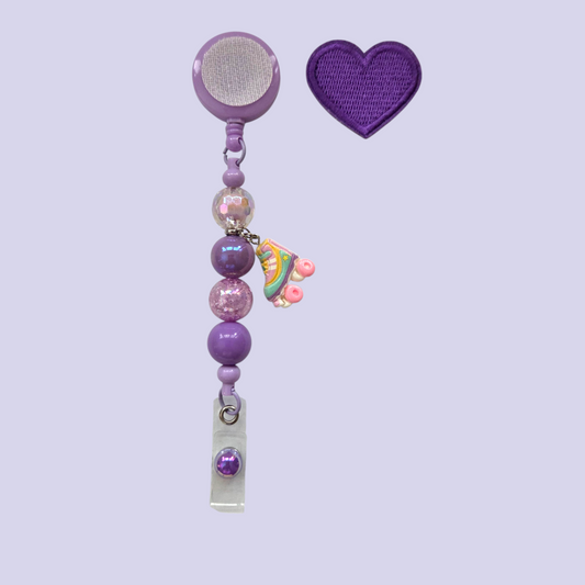 Interchangeable Heart Patches Badge Reel with Acrylic Beads & Roller Skate Charm, / Retractable ID Holder
