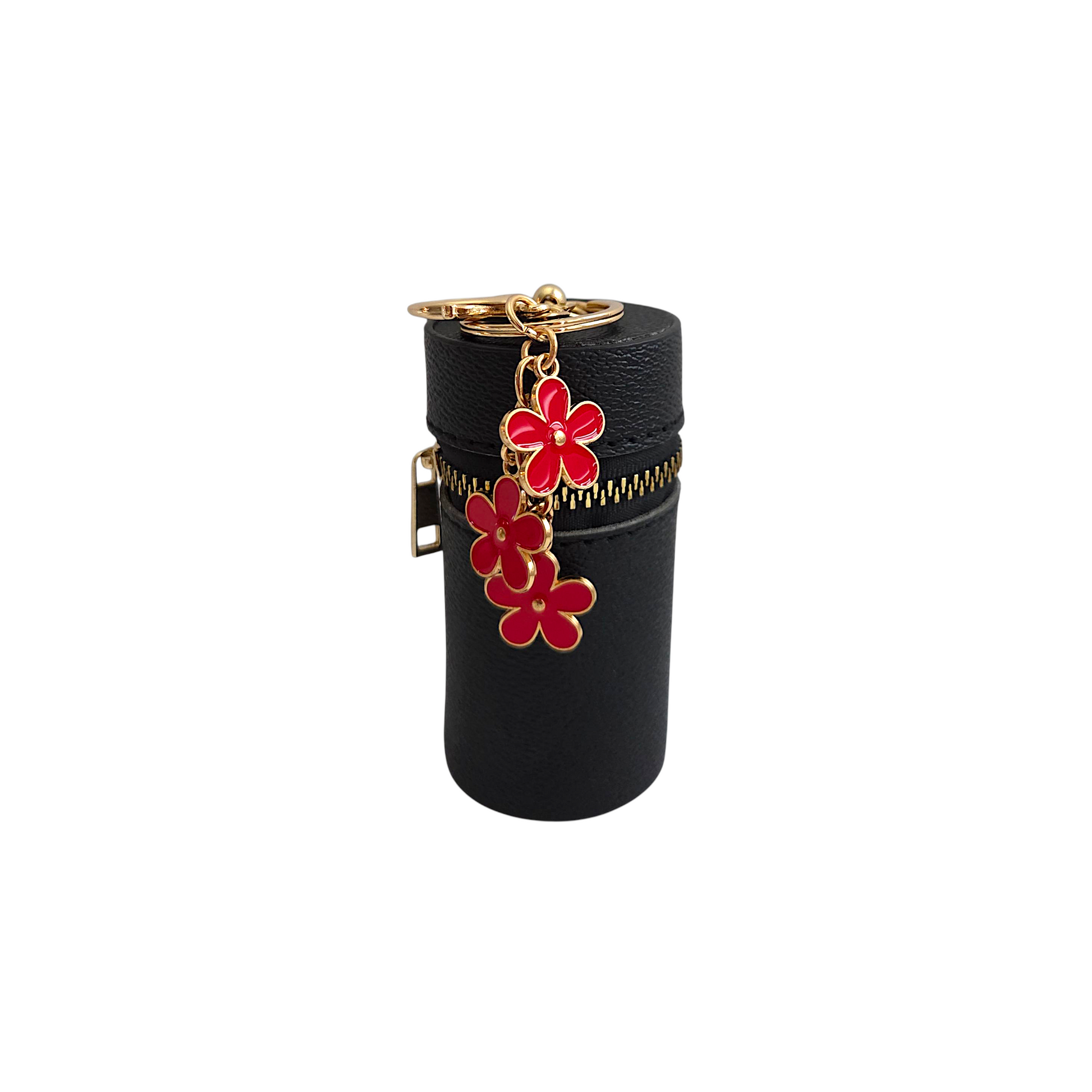 Keep your small items and keys organized with the Black Mini Cylinder Keychain Purse! Perfect for on-the-go touch-ups and carrying essentials. Don't let its compact size fool you, it's lightweight and convenient.
