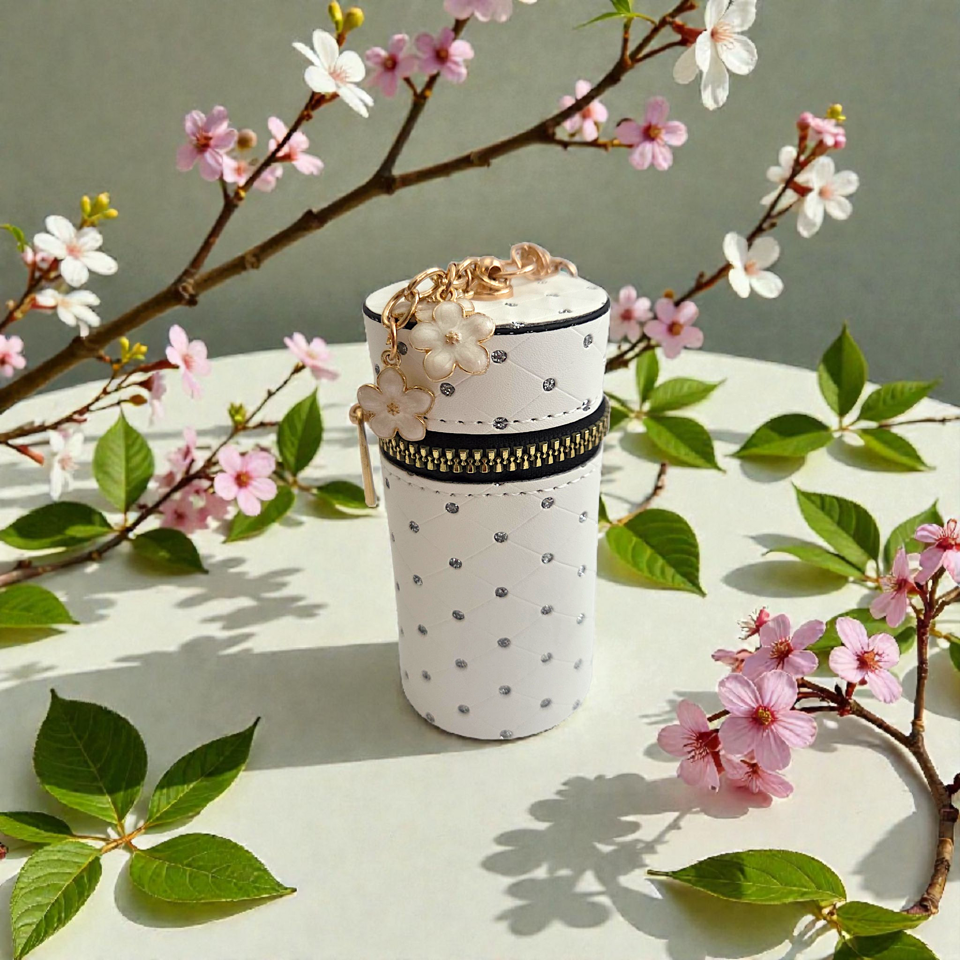 Add a touch of sparkle to your everyday essentials with our Diamond Accented Mini Cylinder Keychain Purse. Available in two color options, this chic keychain is perfect for holding make up and other small items. Small yet mighty, it's a functional and stylish addition to your bag collection.