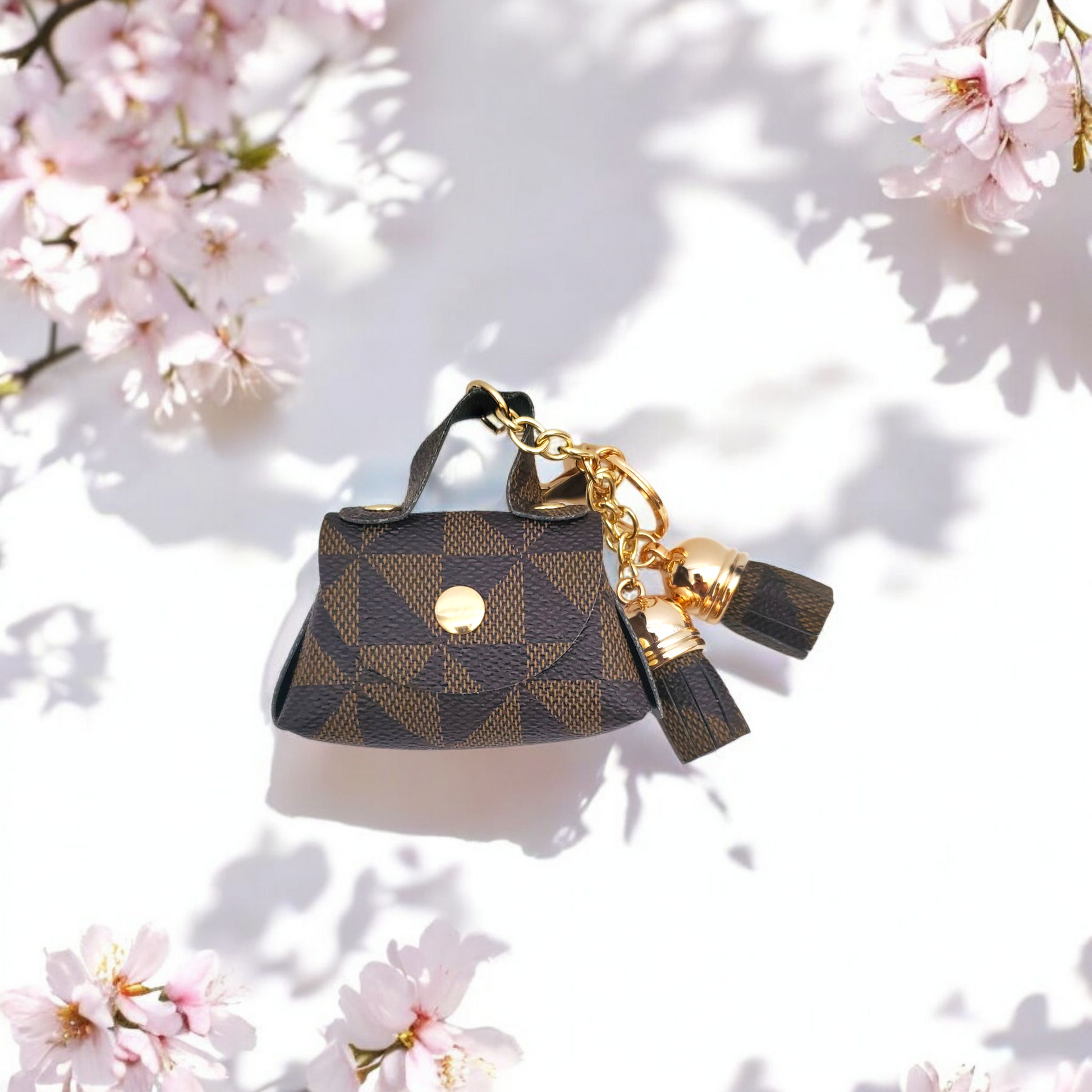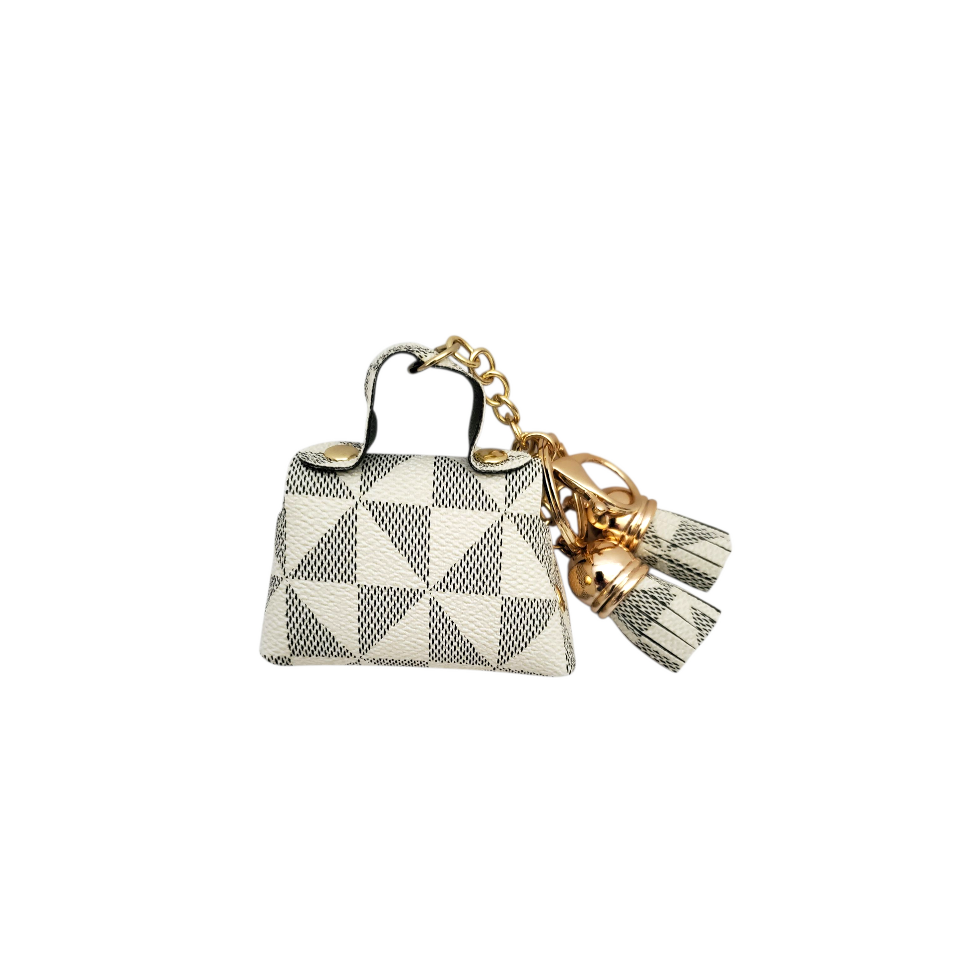 This Geometric Pattern Mini Bag Keychain is a stylish and practical accessory that comes in two available colors. Made with a unique geometric pattern, this keychain adds a touch of personality to any set of keys. Keep your keys organized and easily accessible with this must-have keychain.